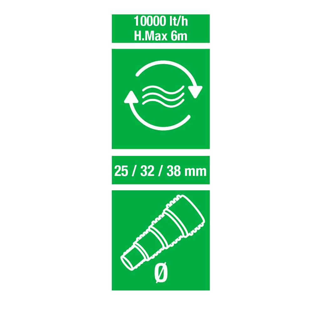 - Portata 10.000 l/h – prevalenza 6,0 metri – consumo 80 Watt – lunghezza cavo 10 metri