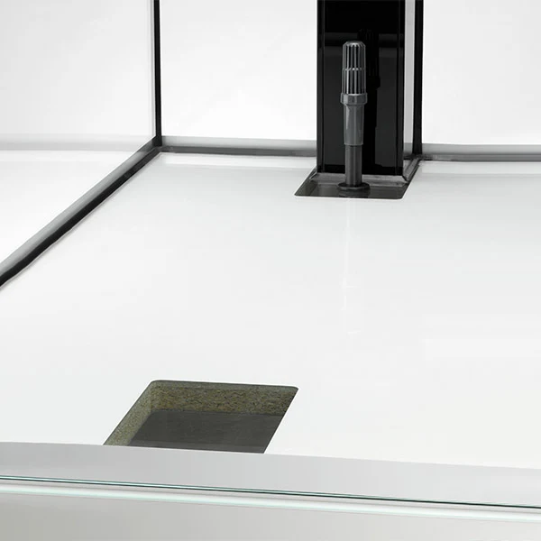 Il est a notรฉ qu’une colonne verticale en verre noir se trouvant dans le fond de l’aquarium et donnant directement dans le meuble, permet de faire passer tout le cรขblage รฉlectrique et les tuyaux pour les rendre invisibles.