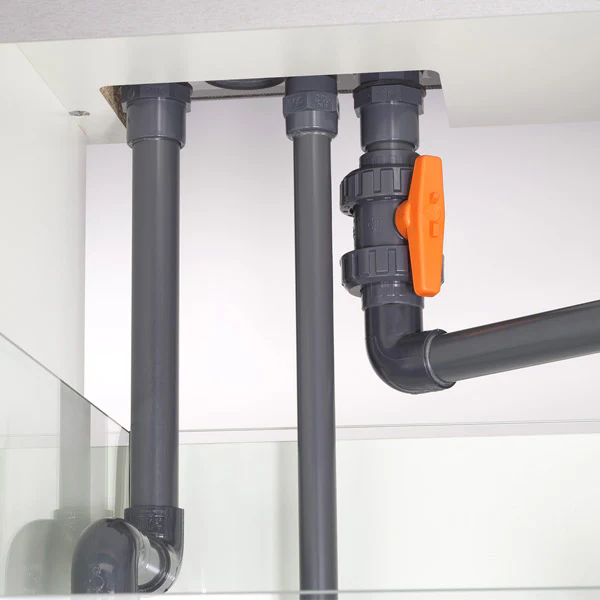 Une surverse avec système anti-débordement intégré, alimente le bac de décantation sous l’aquarium en toute sécurité. Toute la tuyauterie est cachée dans cette colonne.