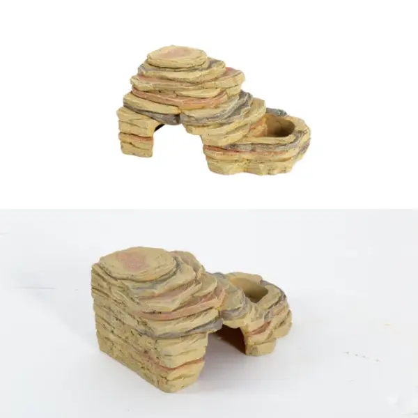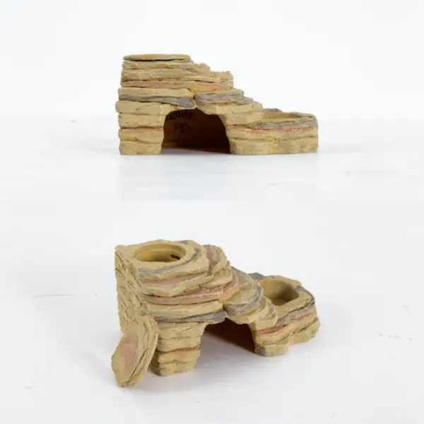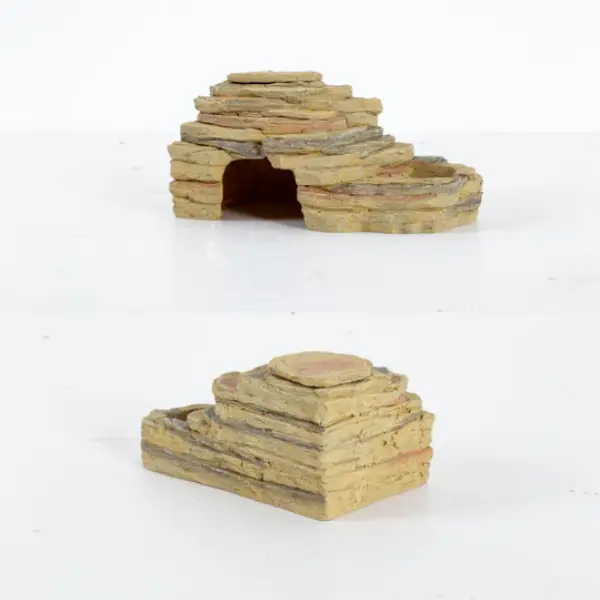 - Double Plat Amovible : Les plats sur le dessus sont souvent amovibles ou conçus pour accueillir des coupelles jetables (type coupelles à gecko), garantissant une hygiène impeccable et une facilité de nettoyage. Un couvercle en forme de roche peut recouvrir l’un des plats pour créer une cachette supplémentaire ou fermer le plat lorsqu’il n’est pas utilisé.