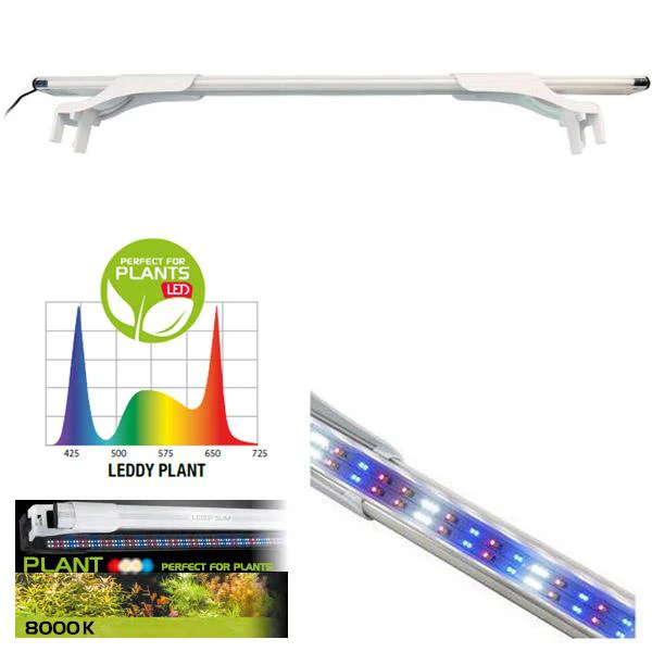 La Leddy Slim Plant contient des LEDs d’une puissance totale de 32W pour 2300 lumens. Ces diodes LEDs Plant ont une température de couleur de 8000°K pour une évolution optimale des plantes d’aquarium.