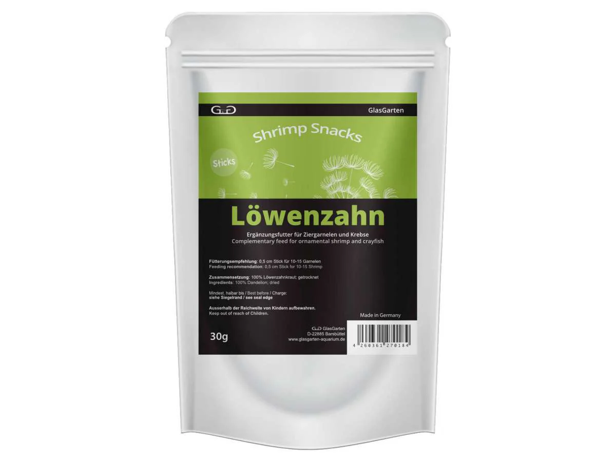 Come le foglie di ortica e di betulla, le foglie di tarassaco sono molto richieste per gamberetti e simili. Sostanze amare, vitamine, minerali, inulina, glicosidi, triterpenoidi, colina e potassio fanno di GlasGarten Dandelion Snacks un utile spuntino fuori pasto.