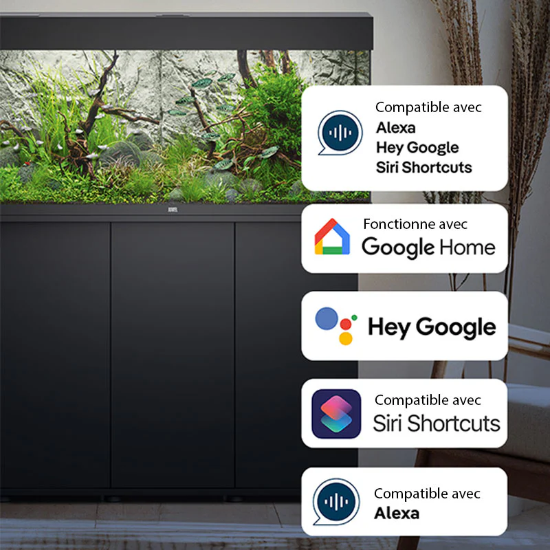 Connectivité fiable Les rampes LED HeliaLux peuvent être contrôlées de n’importe où grâce à l’app MyJUWEL, ainsi que par commande vocales via Alexa, Siri et Google. L’AppControl fonctionne sur un réseau WIFI 2,4 GHz : vérifiez que votre box ou répéteur supporte cette bande ou le mode auto (2,4 / 5GHz). |