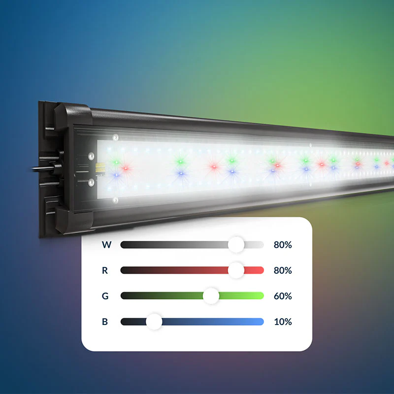 - Contrôle complet des canaux WRGB (blanc, rouge, vert, bleu), pour modeler finement l’ambiance lumineuse selon les besoins de vos habitants aquatiques.