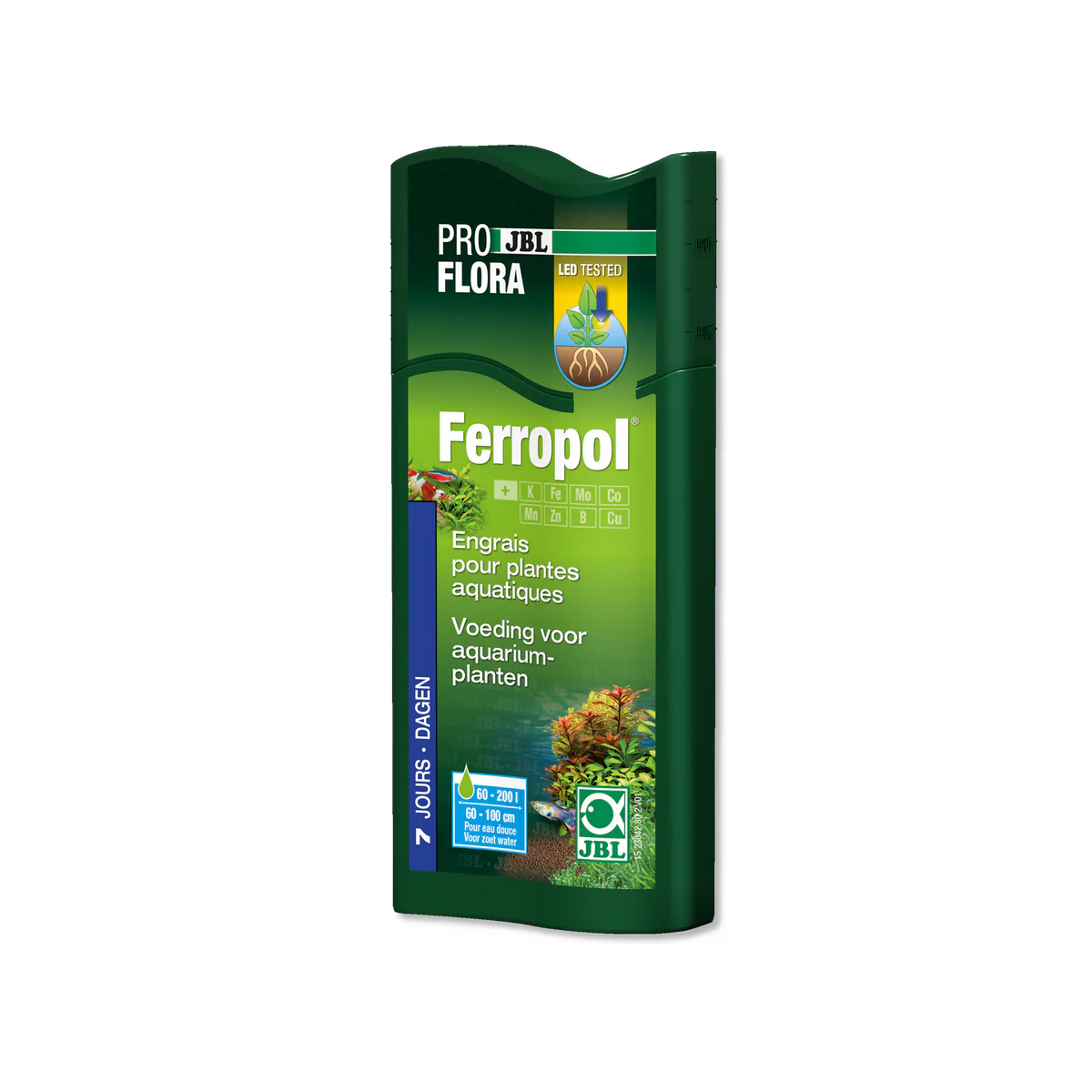 - Senza fosfati e nitrati. Supplisce alla carenza cronica di ferro e di potassio. Ogni settimana o dopo aver controllato il contenuto di fertilizzante (JBL Fe Test-Set) aggiungere 5 ml/20 litri.