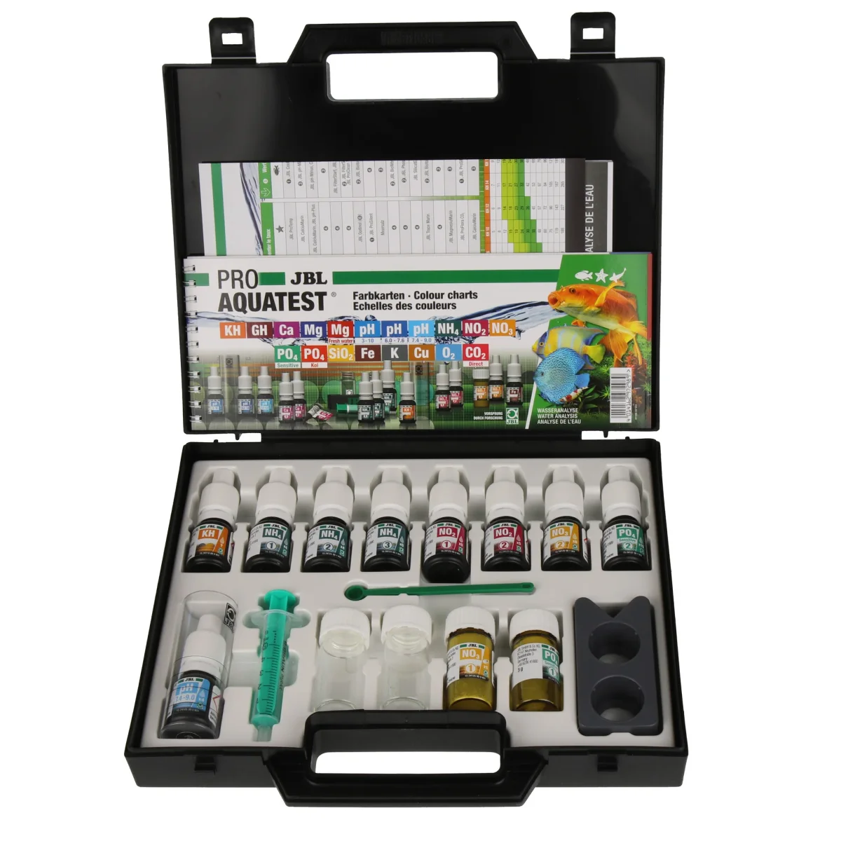 - Contiene i test per la durezza carbonatica, il pH, l’ammonio/l’ammoniaca, il nitrito, il nitrato e il fosfato