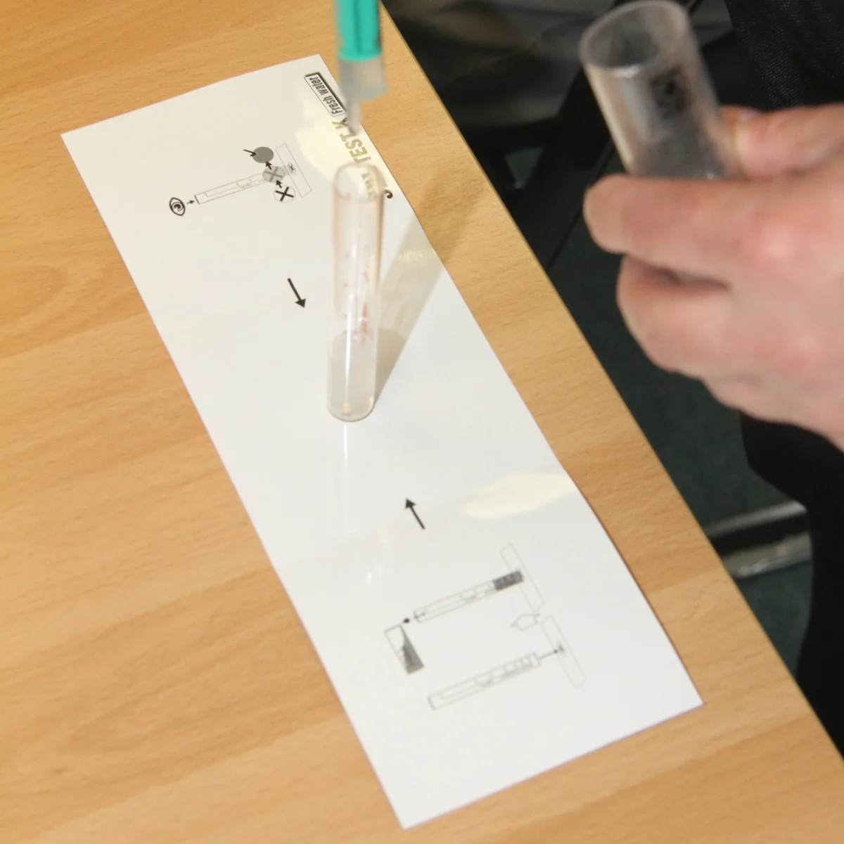 Versare l’acqua torbida nella cuvetta in vetro finché la croce sul fondo non risulta invisibile.