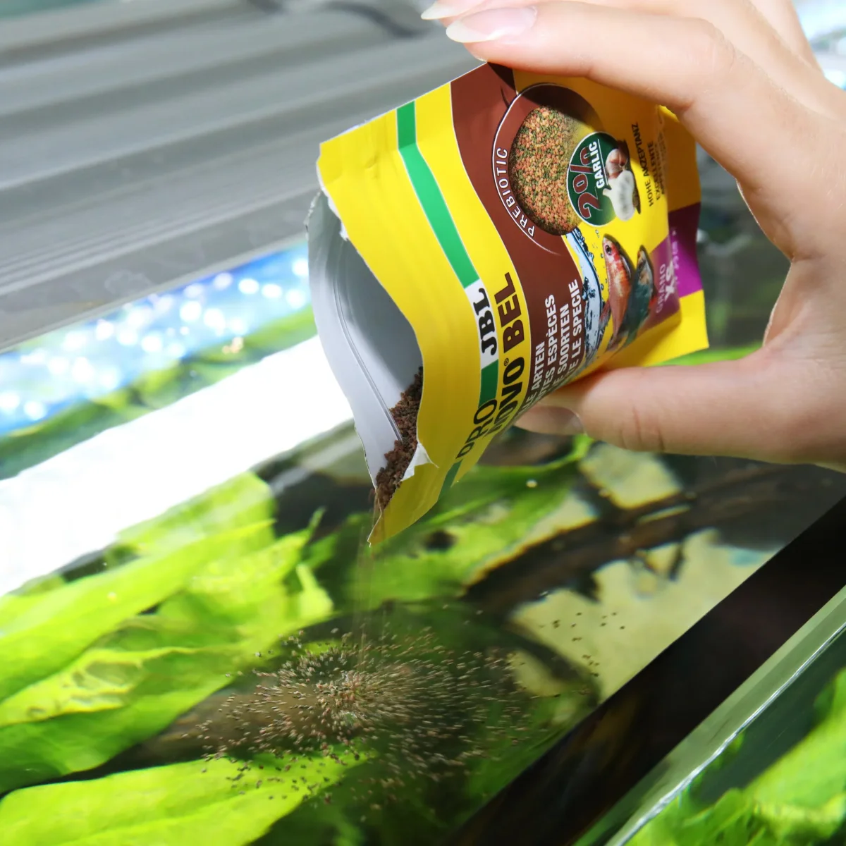 - Mangime prebiotico per pesci d’acquario: speciali fibre alimentari nel mangime forniscono ai batteri intestinali benefici il cibo per una digestione sana