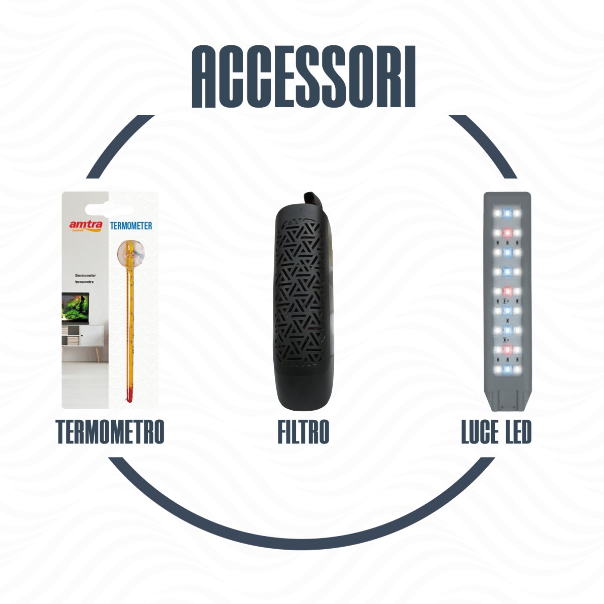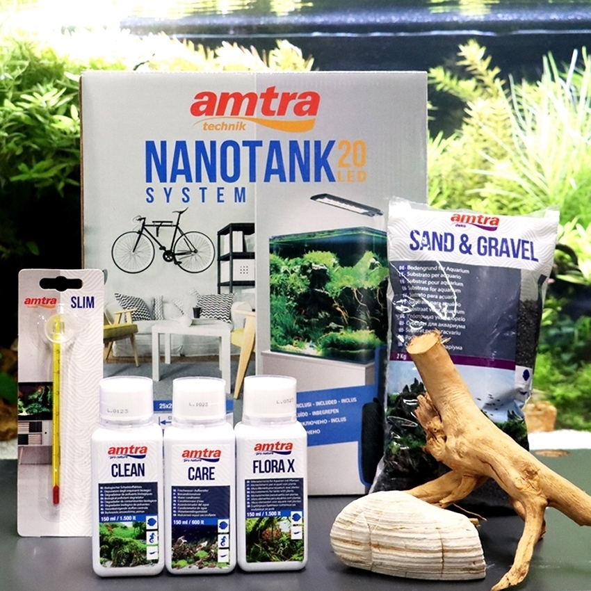 - Trattamento acqua: Biocondizionatore per acquari Amtra Care (150 ml), Attivatore batterico acquario Amtra Clean (150 ml), Fertilizzante Amtra Flora X (150 ml).