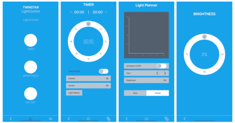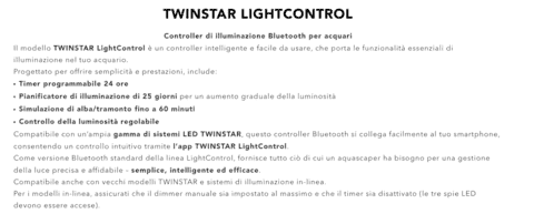 LightControl Standard (Bluetooth) – Regola la luminosità in 100 passaggi, imposta i timer e personalizza le transizioni alba/tramonto (fino a 60 minuti) tramite l’app Twinstar.