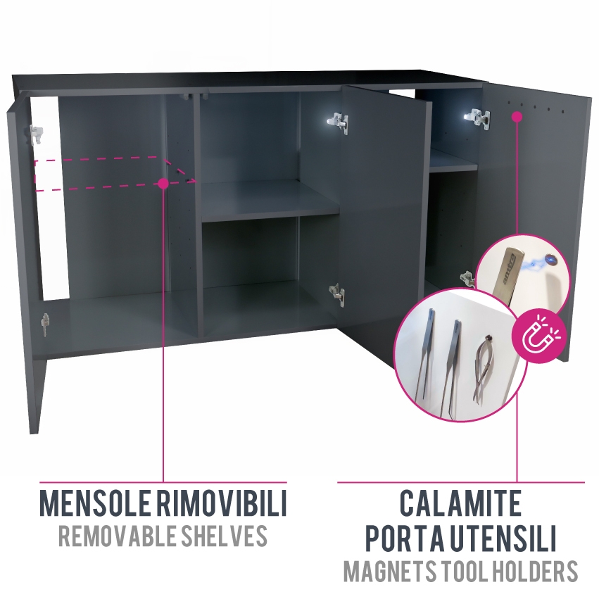 Mobile per acquario in legno per Amtra Alux Caratteristiche: Supporto per acquario in legno laccato lucido. Ante con sistema “push/pull” e cerniere rallentate. Luce led con sensore a pressione per illuminare i vani interni del mobile. Il TOP di gamma per la categoria “acquari” / alta qualità e design moderno Disponibile in colorazione BIANCO o GRIGIO DISPONIBILE NELLE MISURE: cm. 90X45 altezza 83 cm. 120X50 altezza 83 cm. 150X55 altezza 83 ACQUARIO NON INCLUSO: DISPONIBILE QUI KIT COMPLETO ACQUARIO + MOBILE: DISPONIBILE QUI