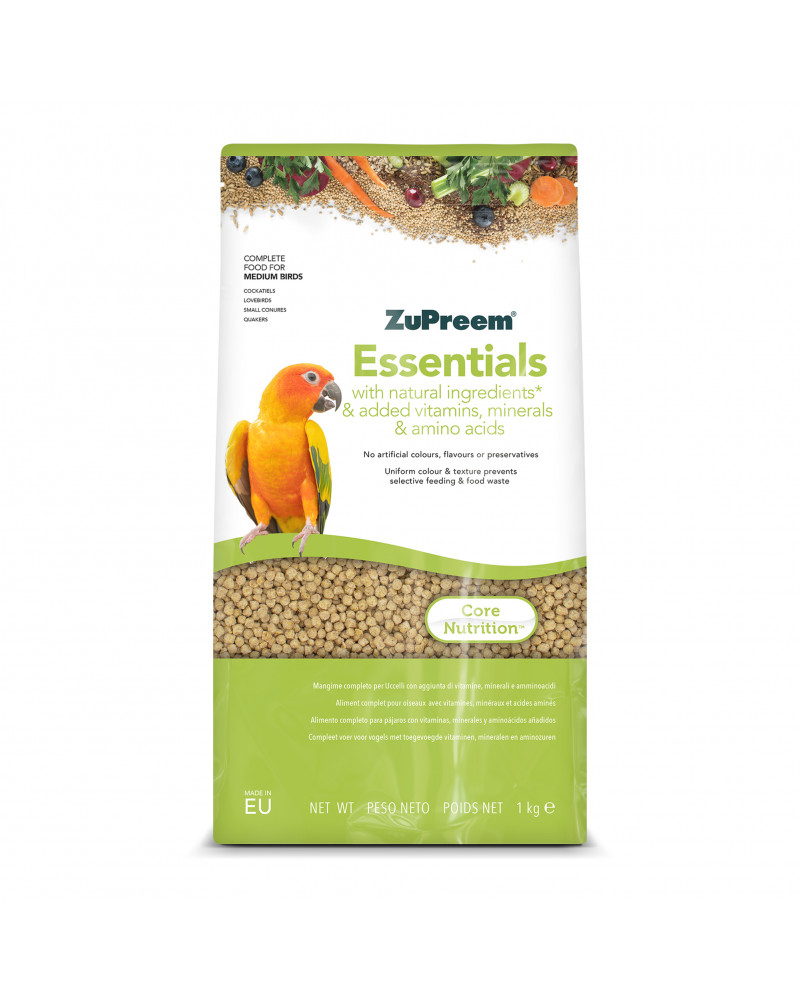 Alimento completo per uccelli ZuPreem Essentials con l’aggiunta di vitamine, minerali e aminoacidi, è un alimento completo per uccelli da compagnia che fornisce ogni giorno un’alimentazione sana e deliziosa a cacatua, piccioncini, piccoli pappagalli, pappagalli argentini e altri uccelli di medie dimensioni che preferiscono pellet di queste dimensioni.