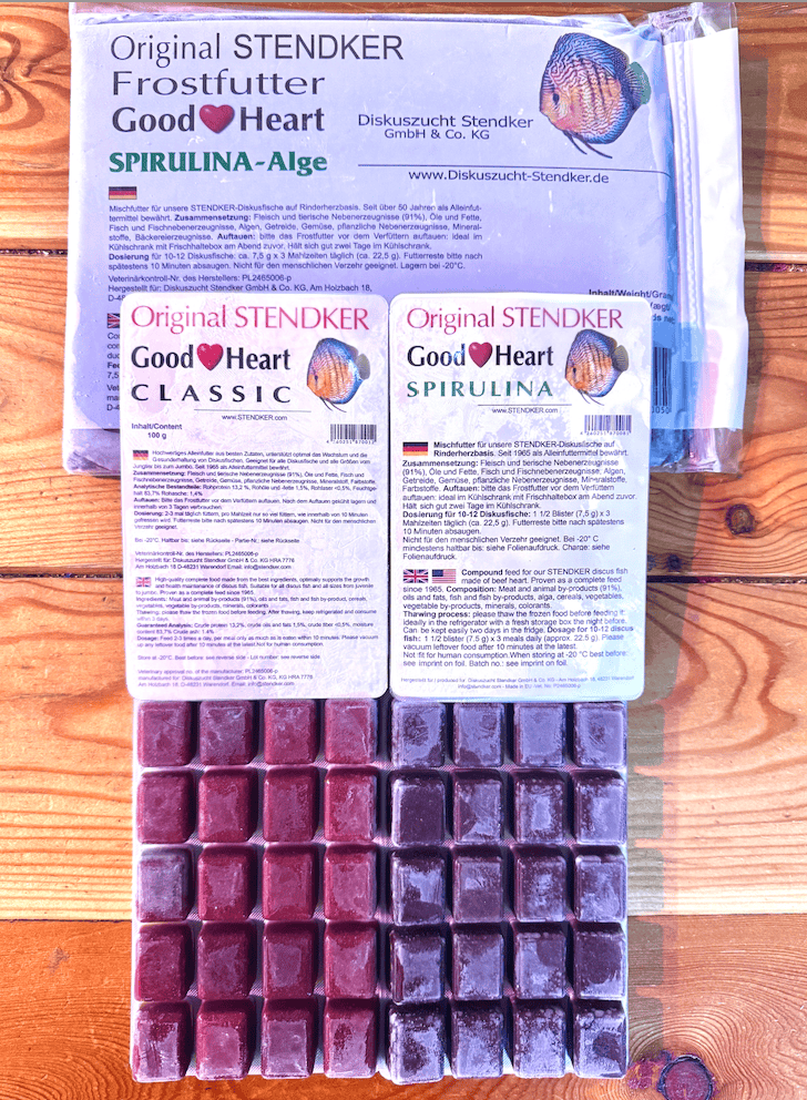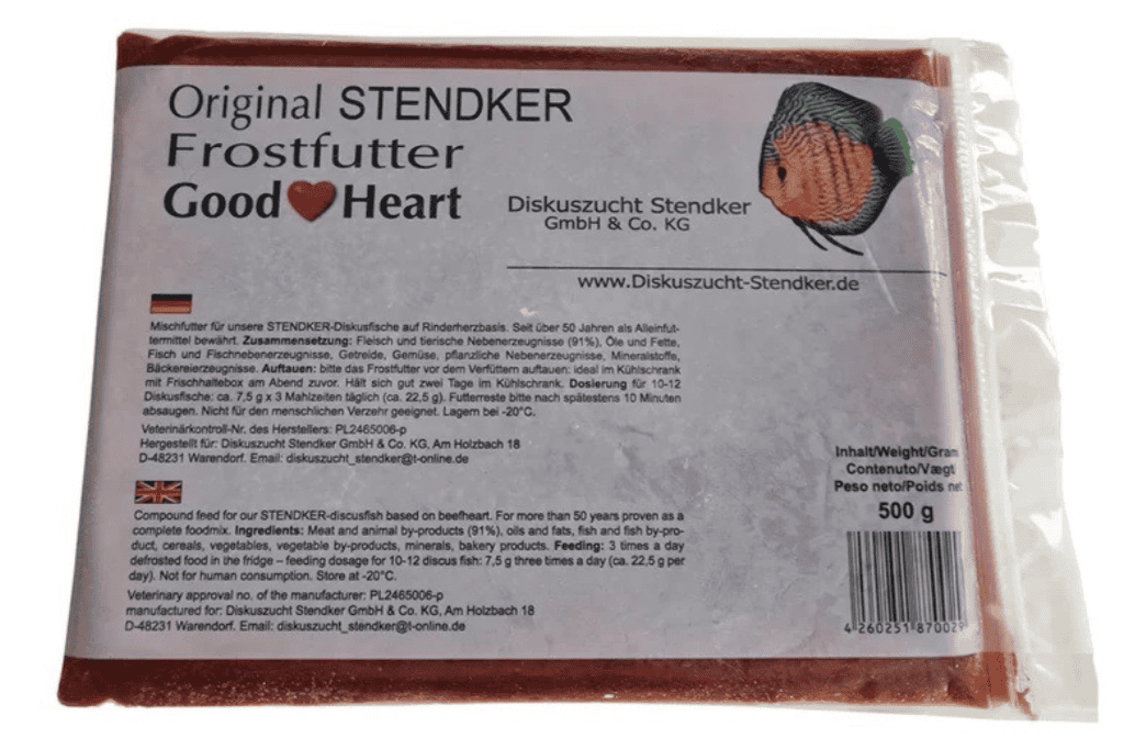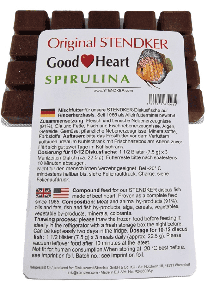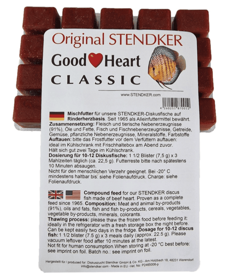 Grazie ai suoi ingredienti di alta qualità, STENDKER Good Heart Classic è stato provato e testato per decenni ed è amato dai pesci discus di tutto il mondo. Alimento gradito anche ad altre specie di pesci d’ acqua dolce. Scongelare completamente il cibo prima di somministrarlo. Estrarre dal freezer la quantità di cibo congelato necessaria per pasto. Onde evitare che l’ acqua possa contaminarsi si consiglia di somministrare una quantità di cibo consumabile in circa 3-5 minuti.