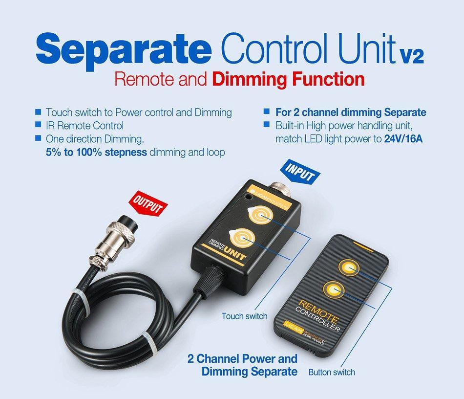 - Modรจle Standard : modรจle standard avec une unitรฉ de contrรดle qui permet de contrรดler individuellement les deux canaux (on/off) et un DIMMER (variateur d’intensitรฉ des LEDs) pour varier l’intensitรฉ des LEDs sans fil pour agir ร distance.