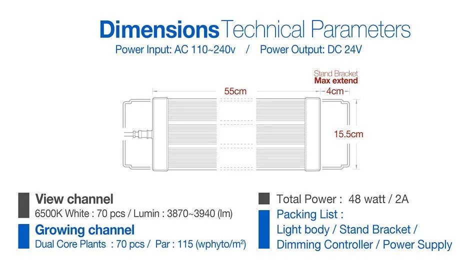 - Modรจle avec Programmateur : dernier modรจle avec un boรฎtier de contrรดle qui gรจre le minuteur et le dimmage (les variations d’intensitรฉ des LEDs). Ce boรฎtier permet la programmation des configurations des LEDs pour chaque jour de la semaine (7 configurations possibles pour chaque canal) et possรจde รฉgalement deux boutons de dimmage/variateurs (un pour chaque canal) pour un rรฉglage manuel.