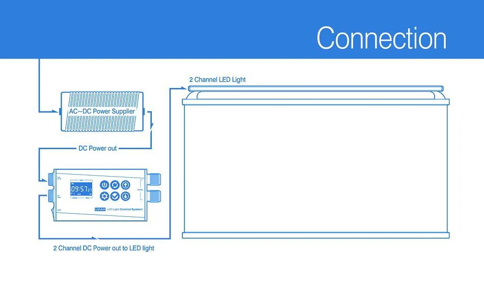 - Modรจle avec Programmateur : dernier modรจle avec un boรฎtier de contrรดle qui gรจre le minuteur et le dimmage (les variations d’intensitรฉ des LEDs). Ce boรฎtier permet la programmation des configurations des LEDs pour chaque jour de la semaine (7 configurations possibles pour chaque canal) et possรจde รฉgalement deux boutons de dimmage/variateurs (un pour chaque canal) pour un rรฉglage manuel.