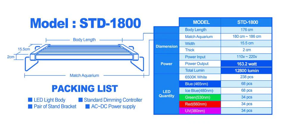 STD-1800 de LICAH est une rampe LED spécialement conçue pour éclairer les aquariums récifaux ouverts de 180 à 186 cm.
