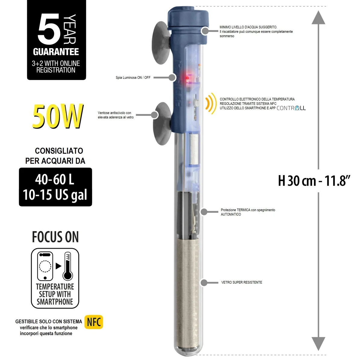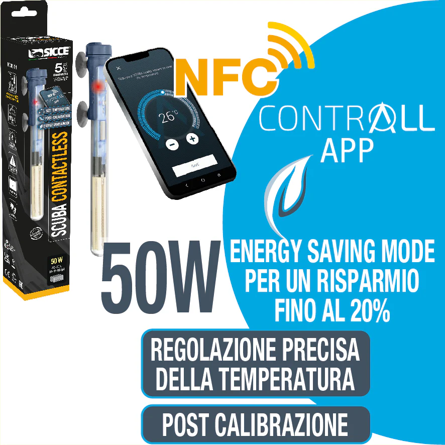 Il Sicce Scuba Contactless 50 W rappresenta la nuova generazione di termoriscaldatori per acquari, con controllo elettronico contactless e gestione smart tramite l’app gratuita ContrAll.