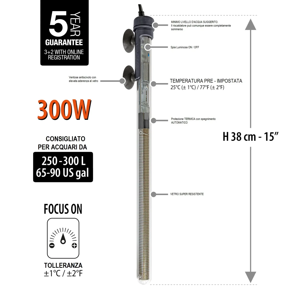 Grazie al design discreto e al vetro ultra resistente, si integra facilmente nell’acquario mantenendo alte prestazioni termiche e consumi ottimizzati. Le ventose di fissaggio garantiscono stabilità, mentre l’indicatore luminoso segnala quando il riscaldatore è in funzione.