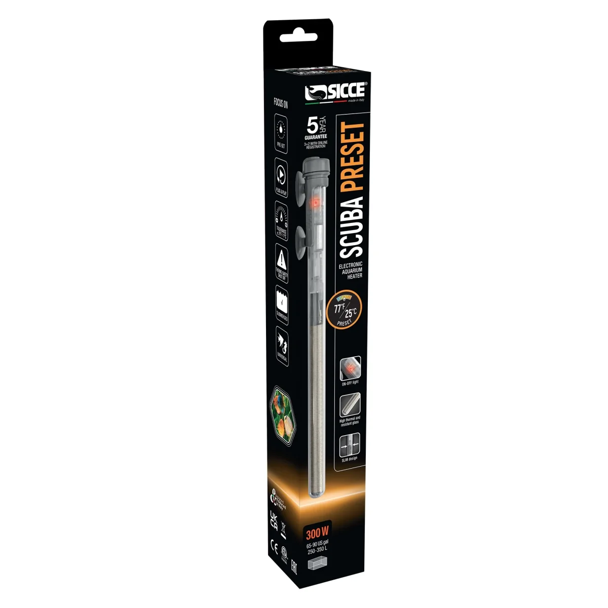 Il Sicce Scuba Preset 300W è un riscaldatore per acquari pre-impostato a 25°C / 77°F, ideale per garantire ai pesci e alle piante un ambiente stabile e confortevole. Robusto, preciso e facilissimo da installare, si adatta perfettamente a vasche fino a 300 litri.