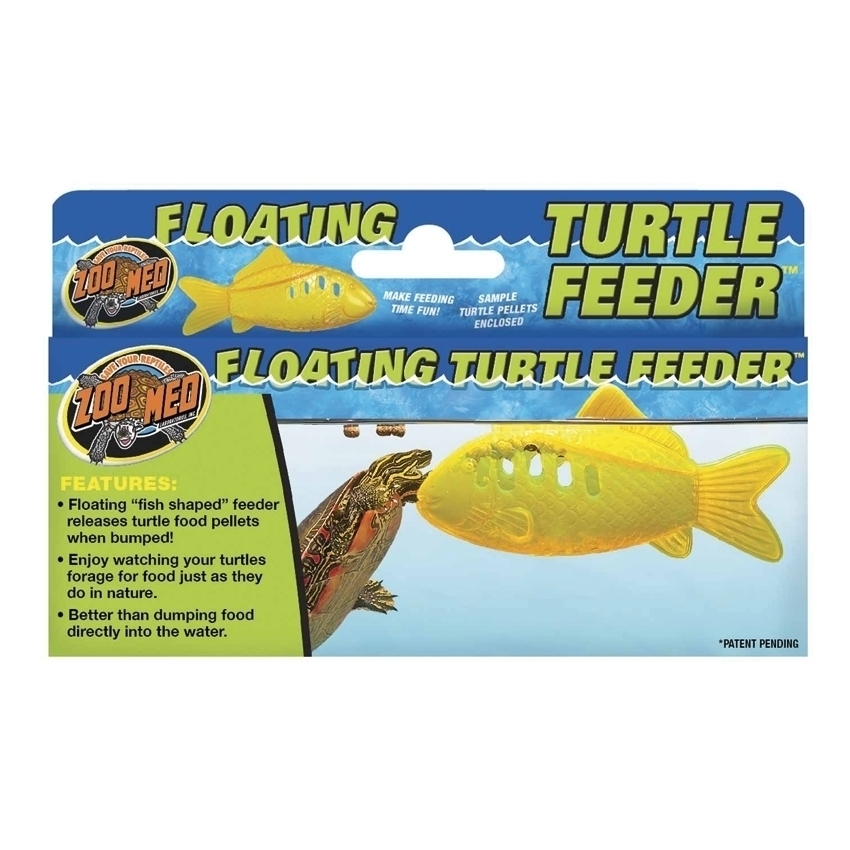 ZOO MED FLOATING TURTLE FEEDER Zoo Med’s Floating Turtle Feeder™ makes feeding time Fun! Floating “fish shaped” feeder releases turtle food pellets when bumped! In nature, turtles forage for food and often use their front legs to help get their food. Translucent orange, allowing them to see the food pellets inside. No longer do you have to simply dump their food into the water. Provides a revolutionary new way to feed your pet turtle. Enjoy watching your turtles forage for food just as they do in nature. Better than dumping food directly into the water.